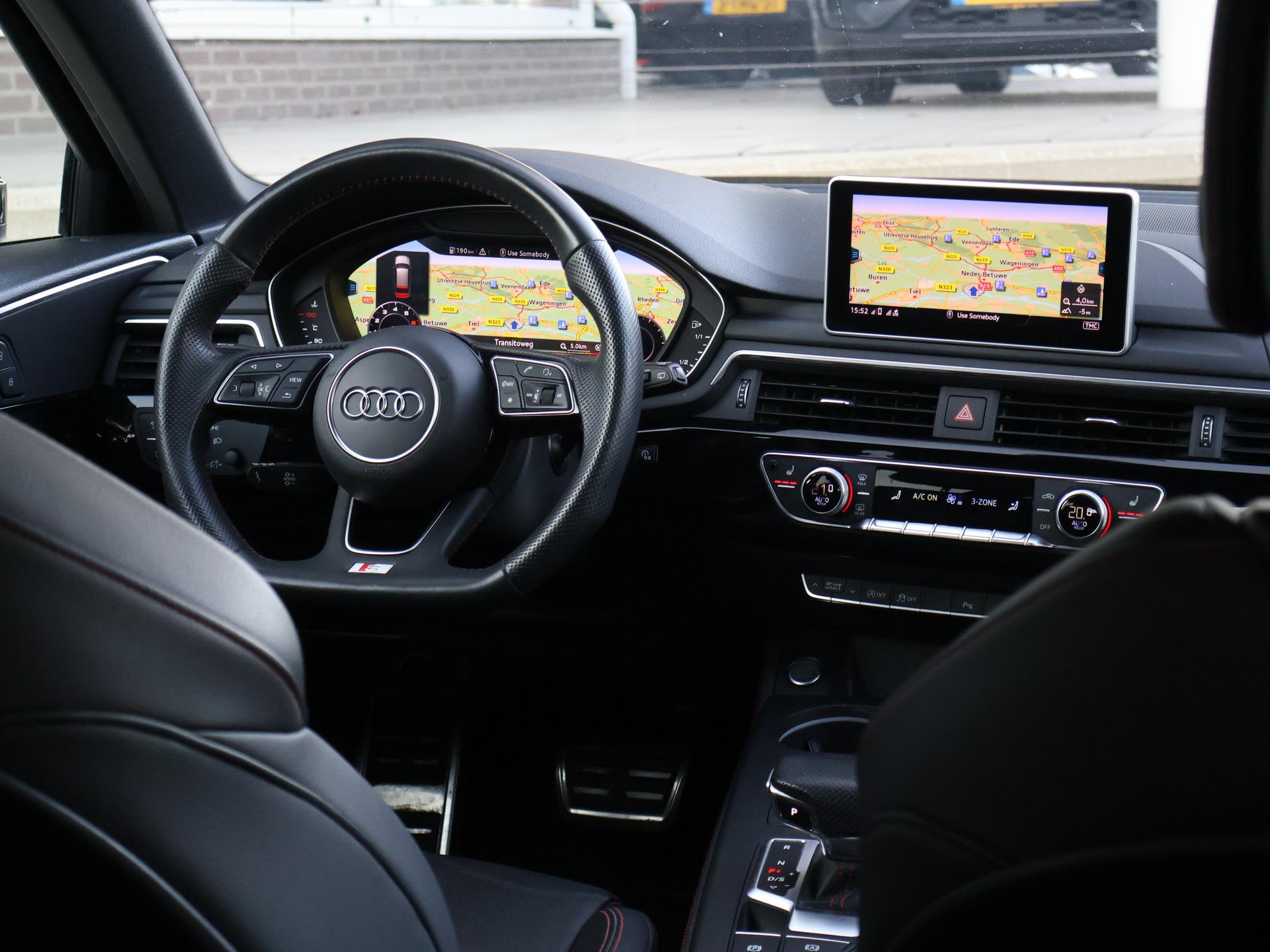 Origineel Nederlanse auto, A4 35 TFSI 1.5 150 PK Automaat, Sport S Line Black Edition uitvoering in de topkleur Quantumgrijs met 20 inch lichtmetalen velgen, Zwart volledig leder sportinterieur met rood stiksel en verlengbaar zitvlak, Leder sportstuurwiel, Stoelverwarming, Zwarte hemelbekleding, Afneembare trekhaak, Privacy glass, Zwarte exterieurstyling, Virtual cockpit digitale cockpit met verschillende thema's en navigatie kaartweergave, 3-Zone Climate control met bediening achterin, Cruise control, Parkeersensoren voor en achter.