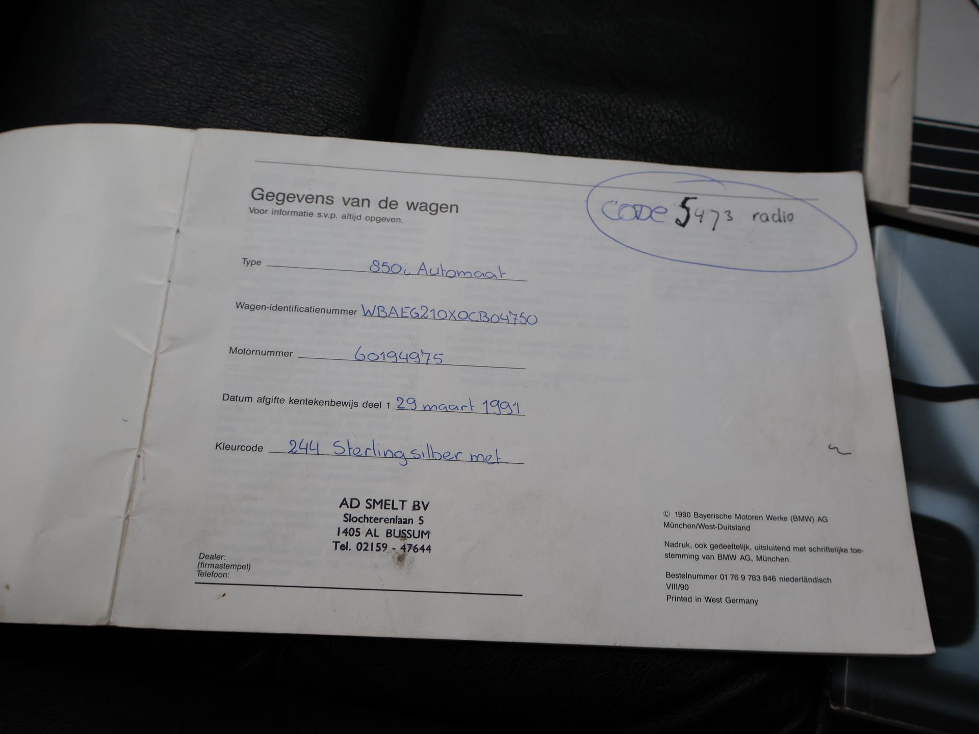 Unieke auto: Origineel Nederlandse BMW 850 Ci van 1991 met de originele boekjes compleet aanwezig, nieuw geleverd door BMW dealer Ad Smelt in Bussum, Uitgebreide NAP kilometerhistorie aanwezig met logisch oordeel, Sterling Silber metallic, 5.0 V12 motor met 299 PK vermogen en automaat, Zwart volledig leder interieur met elektrische stoelverstelling links en rechts, Geheugenfunctie op de bestuurdersstoel, Elektrisch verstelbaar stuurwiel, Elektrisch schuif/kanteldak, Elektrisch zonnescherm voor de achterruit, Climate control met links en rechts gescheiden temperatuur, BMW Bavaria C Business radio, 16 inch lichtmetalen velgen, 4 uitlaten, Alarm systeem met 2 afstandsbedieningen en certificaat + boekjes, Centrale deurvergrendeling op afstandsbediening, Elektrische ramen en spiegels, Boardcomputer, Leder stuurwiel, ASC, Koplampreinigingsinstallatie, Volwaardig reservewiel, APK tot 03-2027.